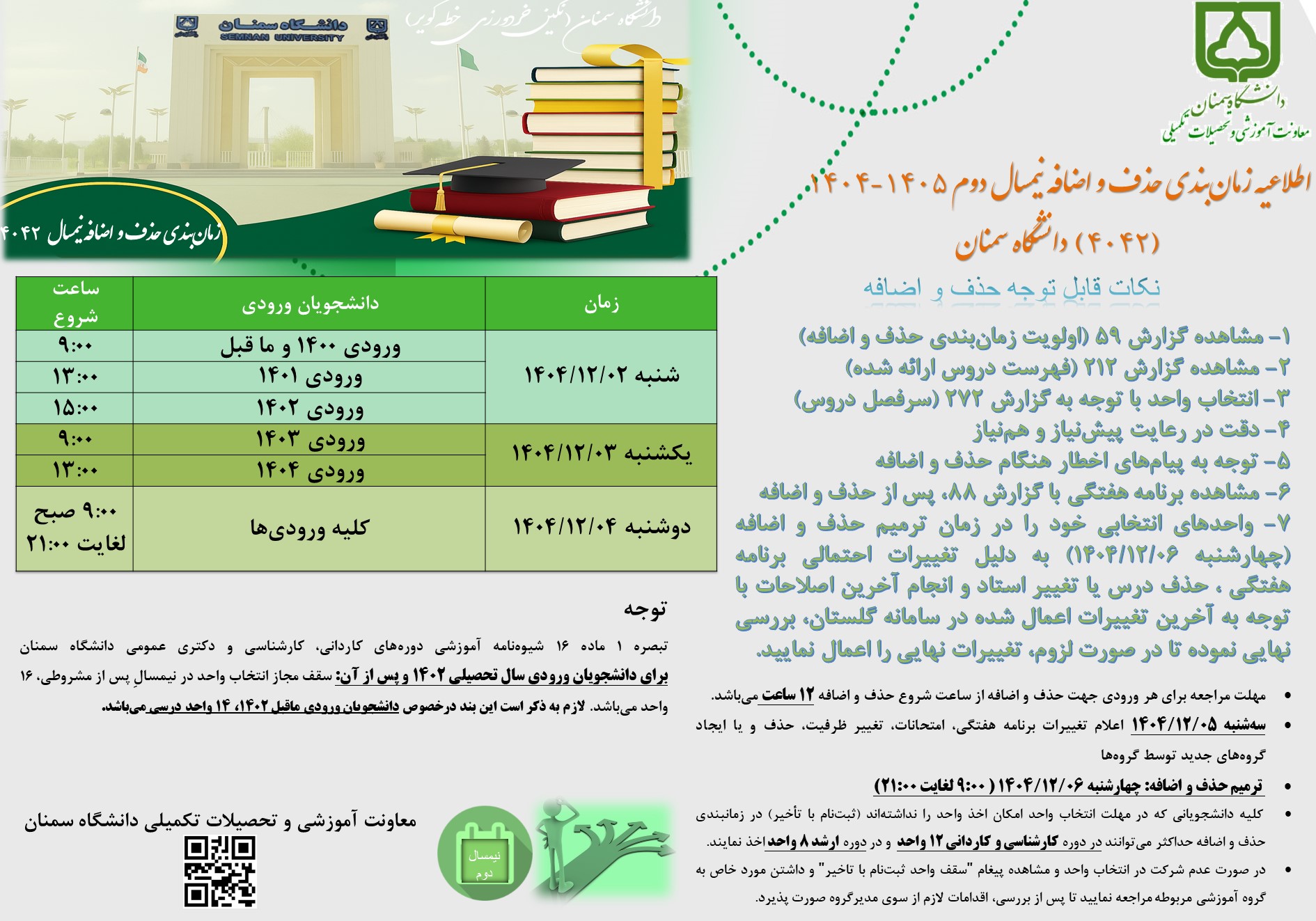 اطلاعیه زمانبندی حذف و اضافه نیمسال دوم 1405 1404 (4042) دانشگاه سمنان 1404/12/02 - 11:06 تعداد بازدید: 7 کلمات کلیدی